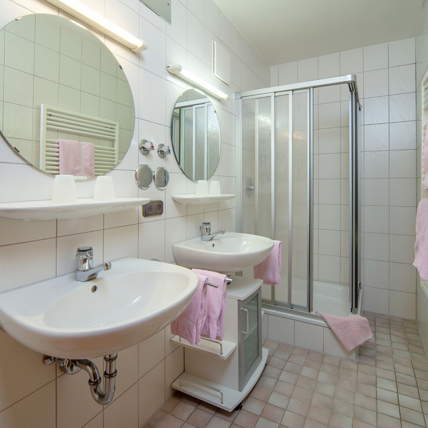 - Bad mit Doppelwaschtisch, Dusche, Fön und Handtüchern