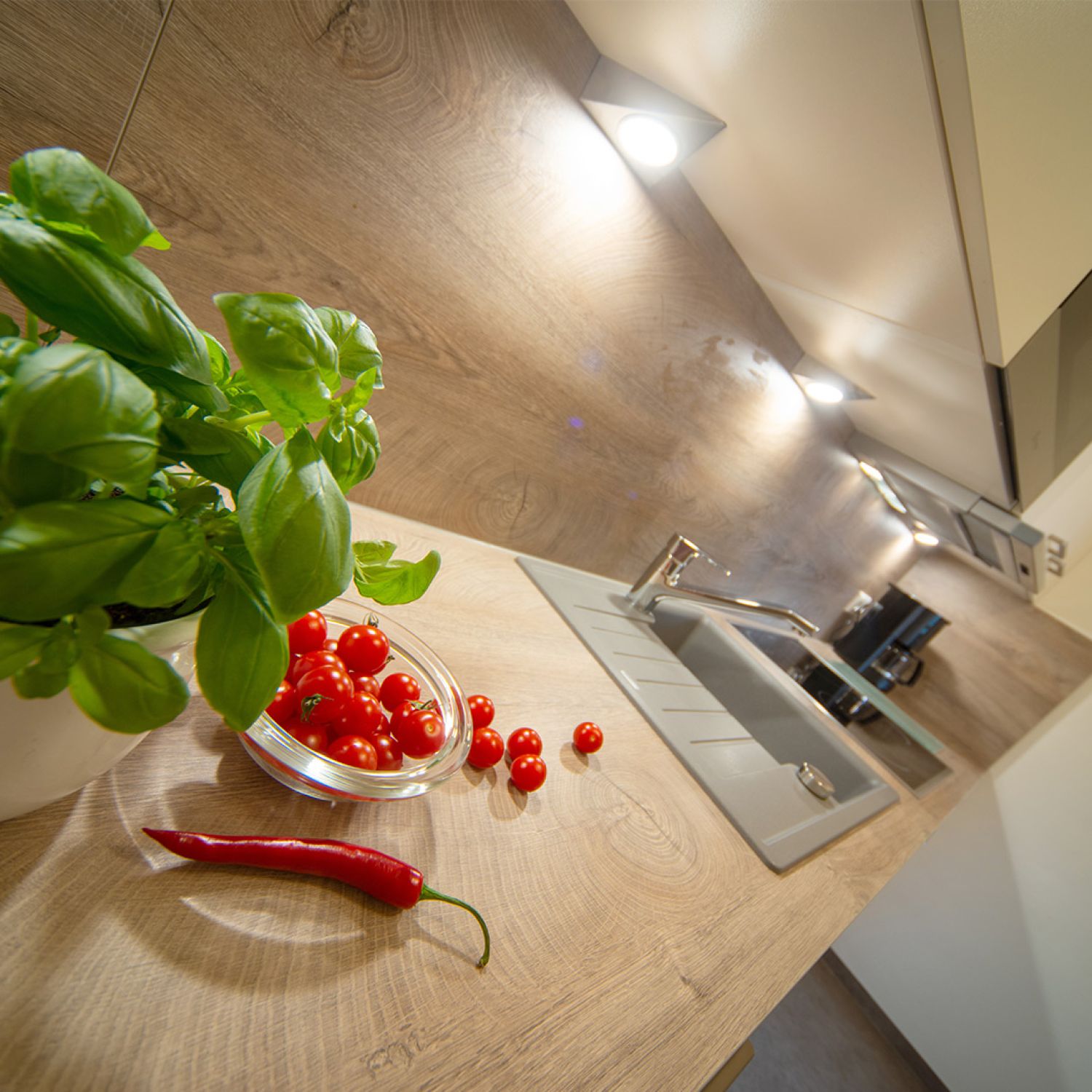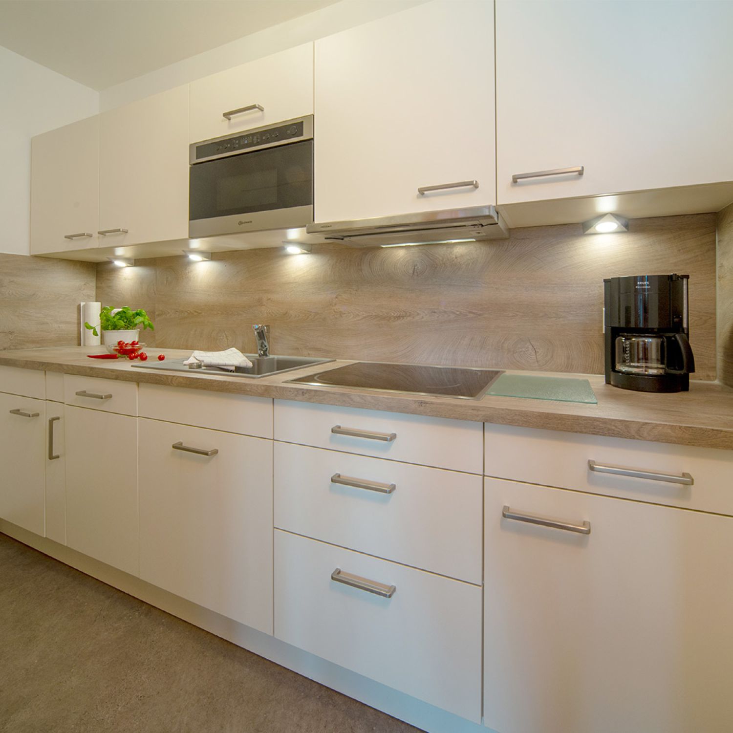 - separate Küche mit Spülmaschine, Mikrowelle, Ceran Kochfeld 4 Platten, Kühlschrank mit Gefrierfach, Kaffeemaschine, Wasserkocher, Eierkocher und Toaster